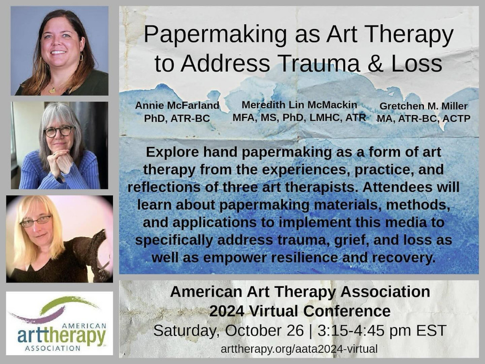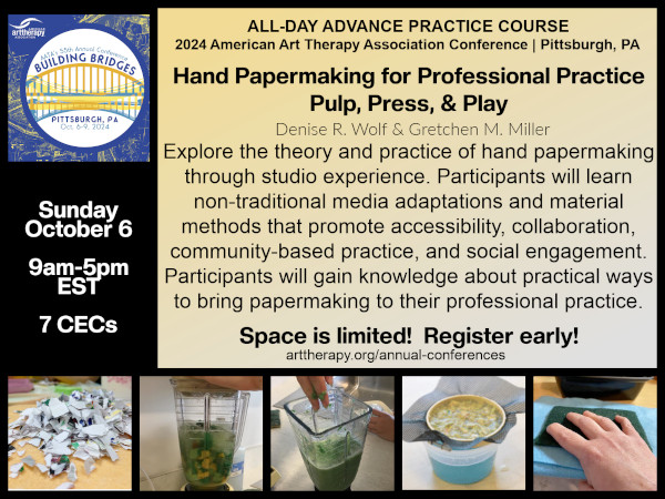Margaret Mahan & Drew Matott will be conducting a one-day papermaking workshop with Art Therapy & Counseling students. Students will learn about Drew & Margaret's many collaborations with art therapists and will make paper from their own clothing.