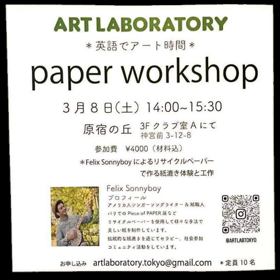 Felix will conduct a one-day papermaking workshop at Art Lab Tokyo, where participants will make paper from Kozo, shredded office paper and flowers.