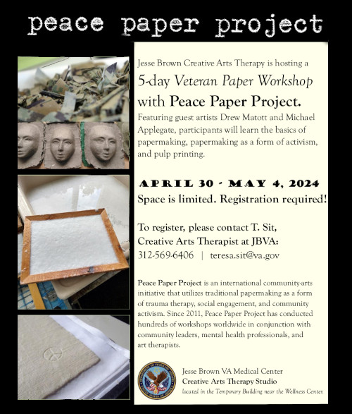 Peace Paper Projet will conduct a five-day Veteran Paper Workshop with In-patient and out-patient recreation therapy groups.
