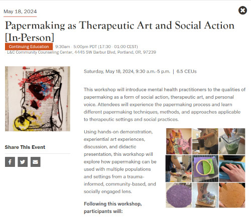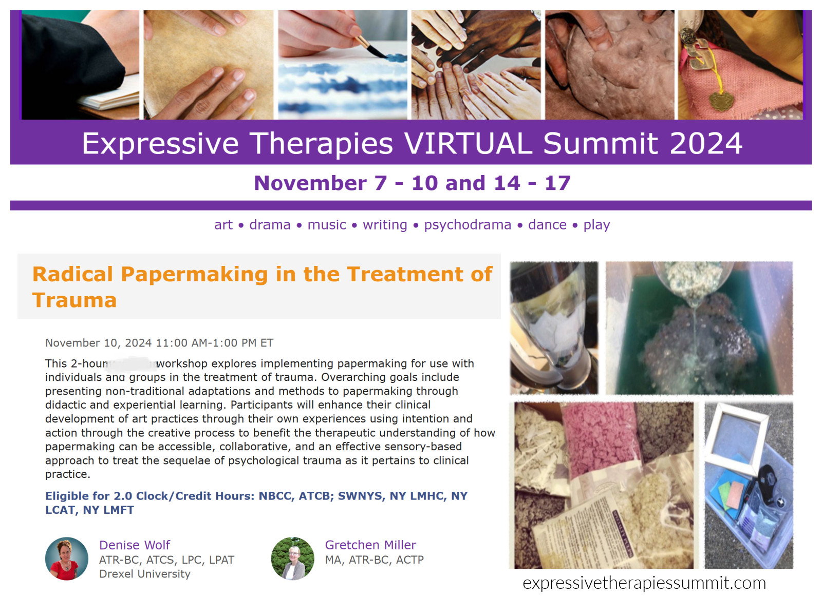 The two-day workshop will explore in depth the papermaking, bookbinding and printmaking processes used by Peace Paper Project. Instructors Drew Matott & Margaret Mahan will lecture and explain how they use the techniques with specific populations while collaborating with art therapists.