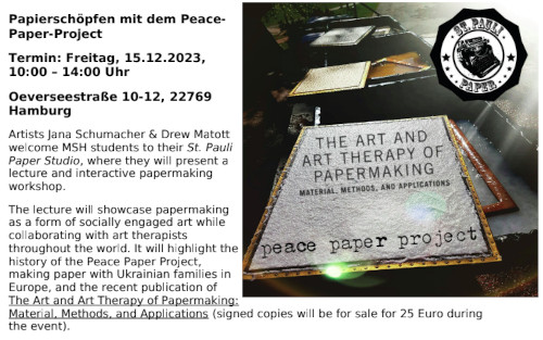 Since 2019, Peace Paper Project Co-Director Drew Matott and Fine Artist Jana Schumacher have offered a series of courses that bring the motivation, practice and vision of Peace Paper to the people of Hamburg.