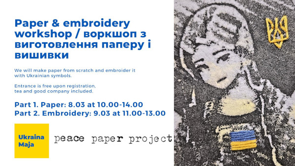 In collaboration with the Ukraina Maja, Peace Paper Project facilitator Drew Matott will conduct a series of papermaking workshops with Ukrainian families. The program will culminate with an evening emroidery workshop led by artist & instructor Alina Paas.